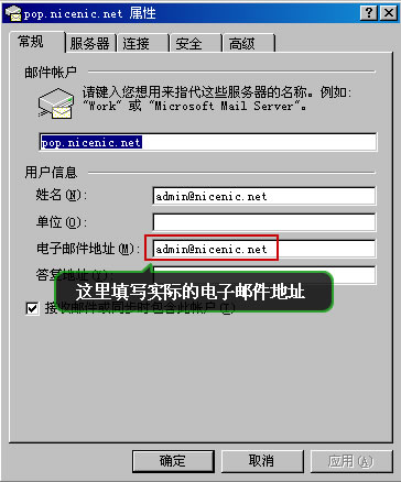 2:如果WEBMAIL收发正常,请检查邮件软件,比如OUTLOOK或者FOXMAIL设置,以下以OUTLOOK为例,按图设置好用户信息中的电子邮件地址为您的电子邮件地址,比如abc@nicenic.com,请设置为全称.